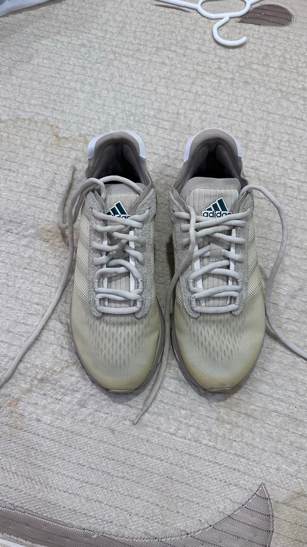 Adidas kadın spor ayakkabıları bağcıklı tasarıma sahip, gri ve beyaz renklerde. Kauçuk tabanlı, stilettolu topuklu, athleisure ve sokak stili için uygun.