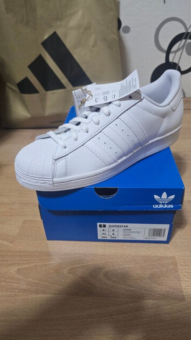 Adidas beyaz Superstar spor ayakkabısı, bağcıklı ve düz kauçuk tabanlı, baskılı desenle trendy casual tarz sunar.