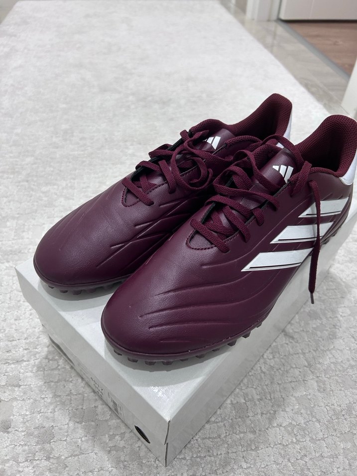 Bordo renk, bağcıklı erkek futbol ayakkabısı. Kauçuk tabanlı, desen içermeyen, sportif ve sokak stili için uygundur. Trendy casual tarzına uyum sağlar. ⚽ Bir kere kullanılmıştır. 46 buçuk numara