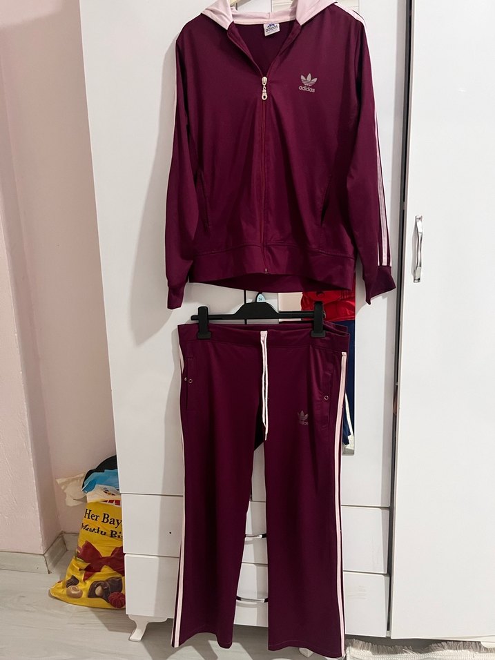 Adidas marka bordo renkli, kapüşonlu ve uzun kollu kadın eşofman takımı. Orta boy ve vücuda oturan kesimiyle rahat ve şık bir spor görünüm sunar. Ürün L bedendir.♀️