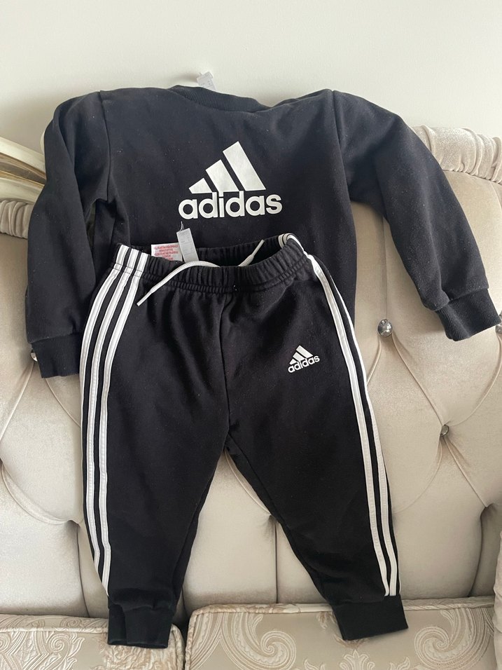 Adidas markalı, siyah renkli, pamuk gibi yumuşak kumaştan yapılmış, fitted kesim eşofman takımı. Üstü crew neck, yapışkan bantlı, baskılı logo ve şerit detaylıdır.