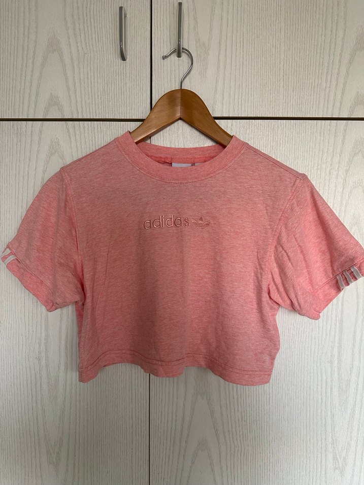 Crop kesim, pembe renkli Adidas tişört. Bir kaç kere kullandım. Artık crop giymiyorum. Alan kişiye şans getirsin ✨