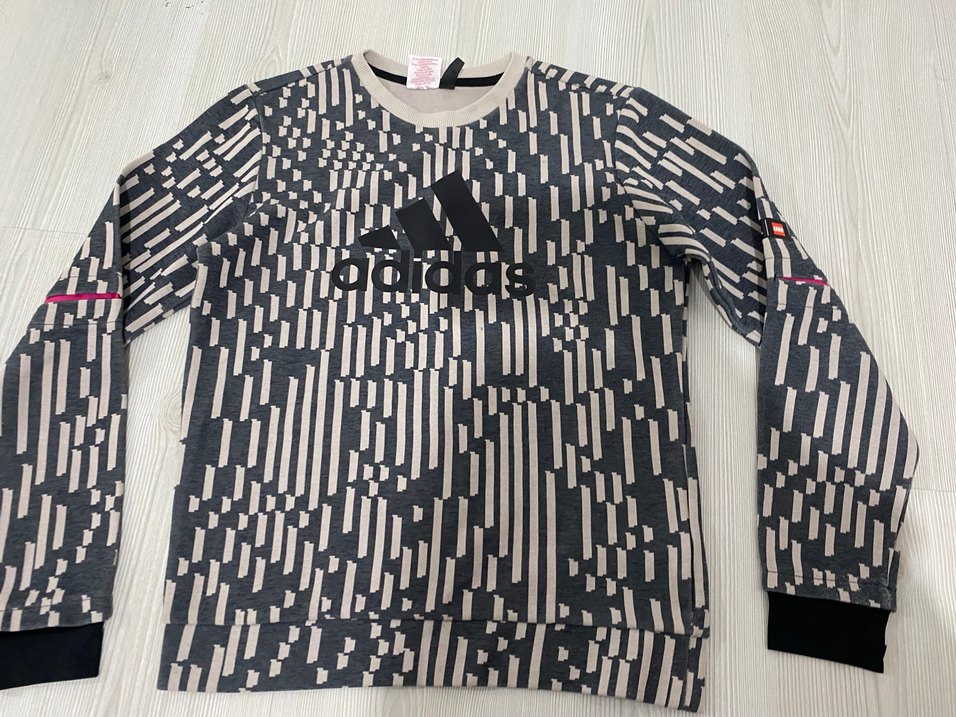 Adidas desenli, uzun kollu, yuvarlak yaka, bol kesim, örme dokulu gri sweatshirt, günlük kullanım için uygundur.