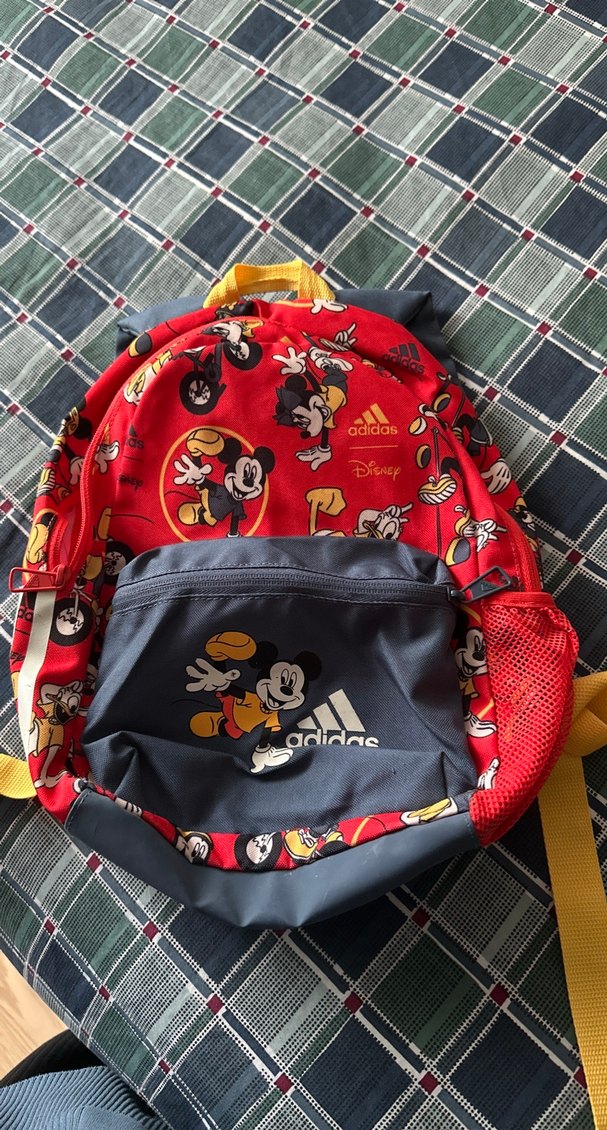 Adidas Disney çocuk sırt çantası, kırmızı ve koyu renklerde Mickey Mouse baskılıdır. Çoklu bölmeleri ve file yan cebine sahiptir.