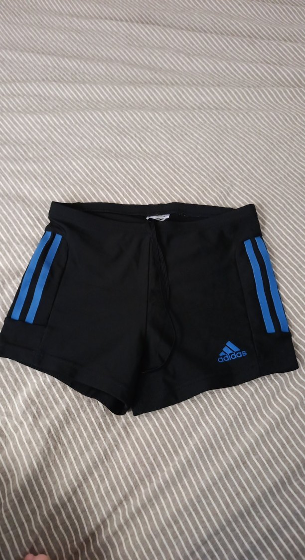 Mavi yan şeritler ve Adidas logosu bulunan siyah erkek çocuk mayo şort. Rahat kesimli, yüzme için uygun.