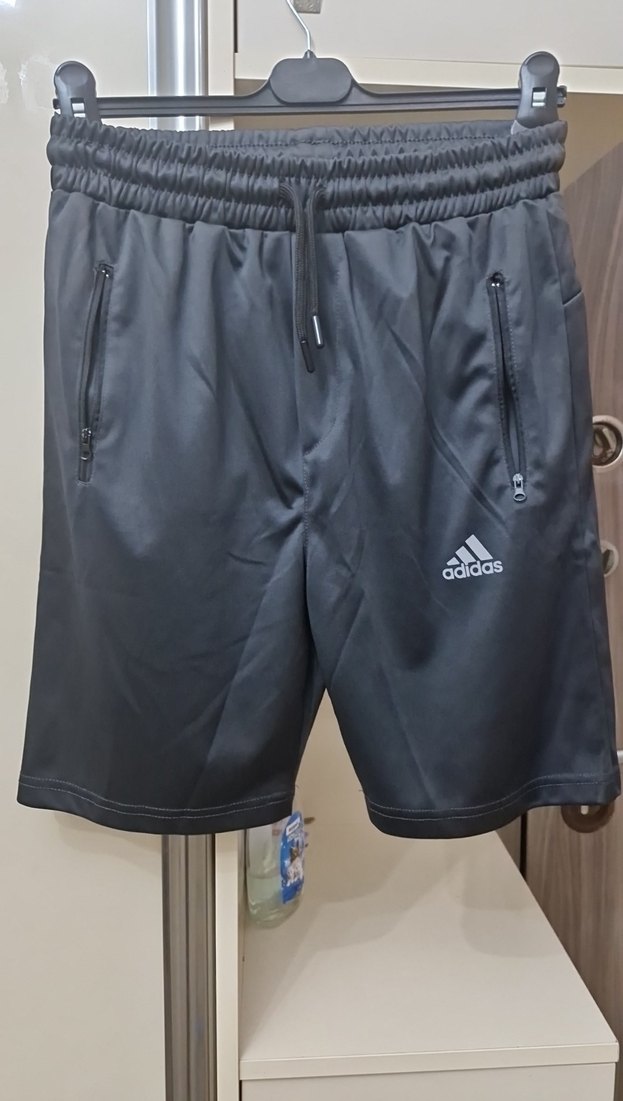 Sentetik kumaştan yapılmış, fermuarlı cepleri olan gri erkek spor şortu, şık ve rahat bir görünüm sunar.