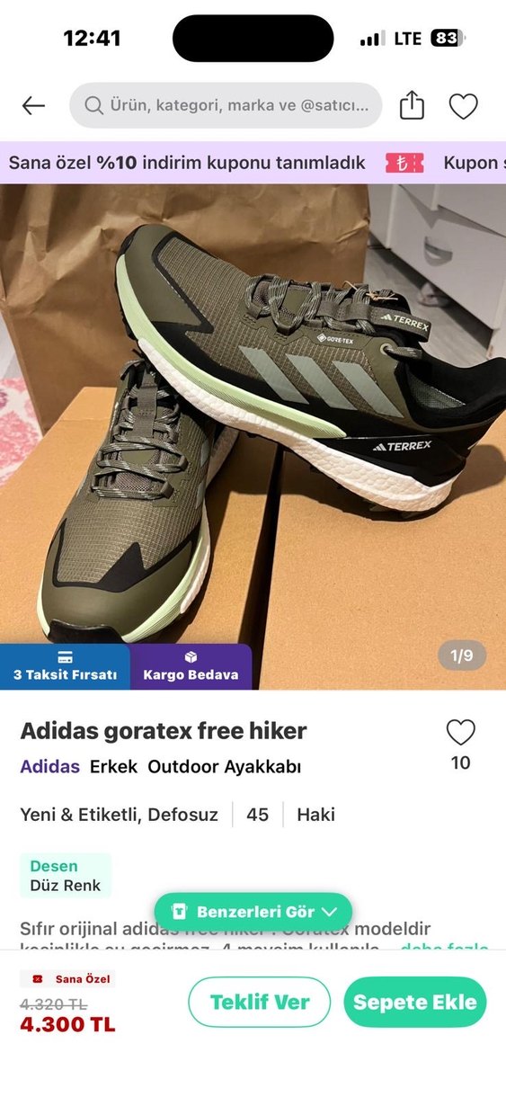 Adidas erkek outdoor ayakkabısı, haki ve gri renklerde, velcro kapanışlıdır. Kauçuk tabanlı, spor ve sokak stili için uygundur. 45 numara, yeni ve defosuzdur.