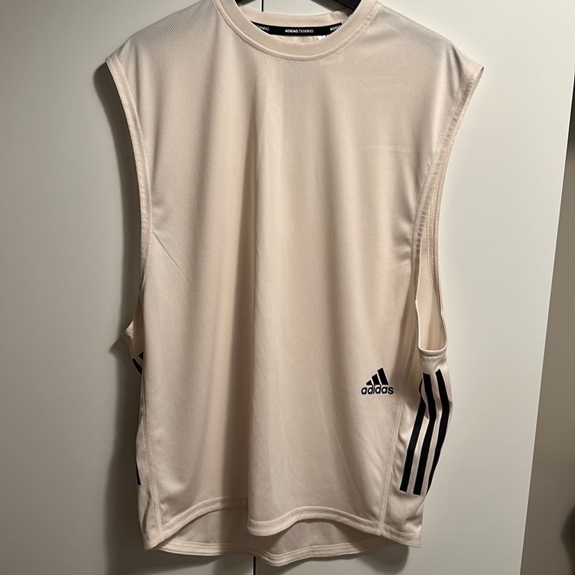 Adidas kolsuz erkek spor tişörtü, yüksek yakalı ve bol kesimdir. Hafif beyaz ve düz tasarımlı, yanlarda siyah çizgiler bulunur. Spor ve rahat kullanım için uygundur.