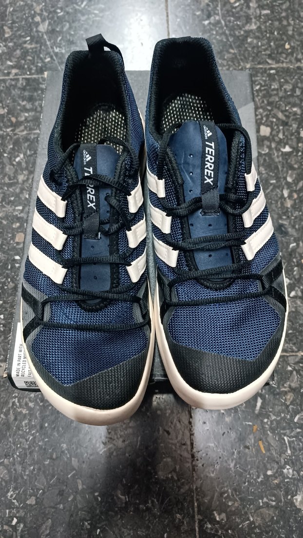 Adidas erkek lacivert su ayakkabısı, kauçuk taban ve Velcro bantlarla spor ve günlük sokak stili için tasarlandı. A.TERREX marka detayları bulunur.