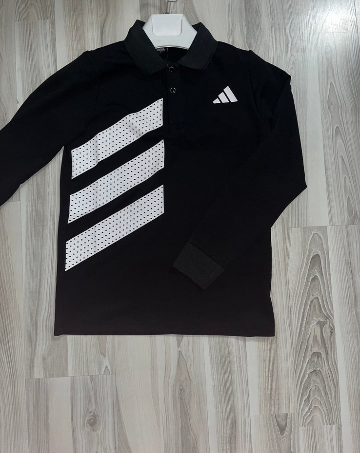 Siyah uzun kollu, yakalı ve baskılı erkek çocuk polo tişörtü. Regular fit kesim, velcro detaylı, sentetik kumaştan üretilmiştir (her beden mevcuttur)