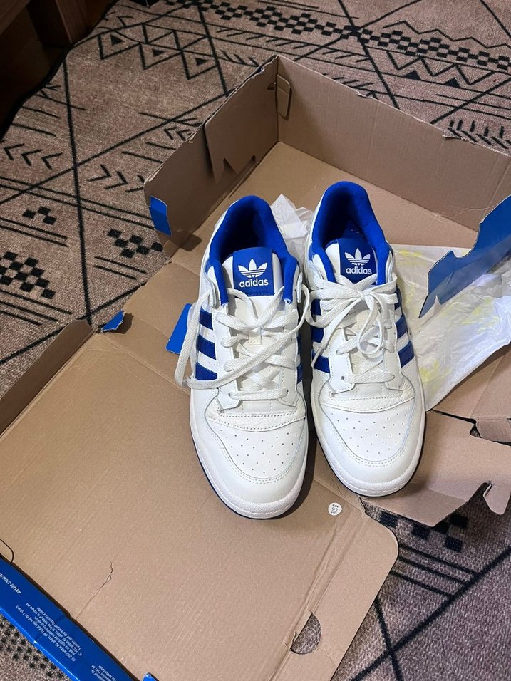 Adidas beyaz erkek spor ayakkabısı, mavi detaylı, bağcıklı ve kauçuk tabanlı, trend ve rahat stil için uygun.