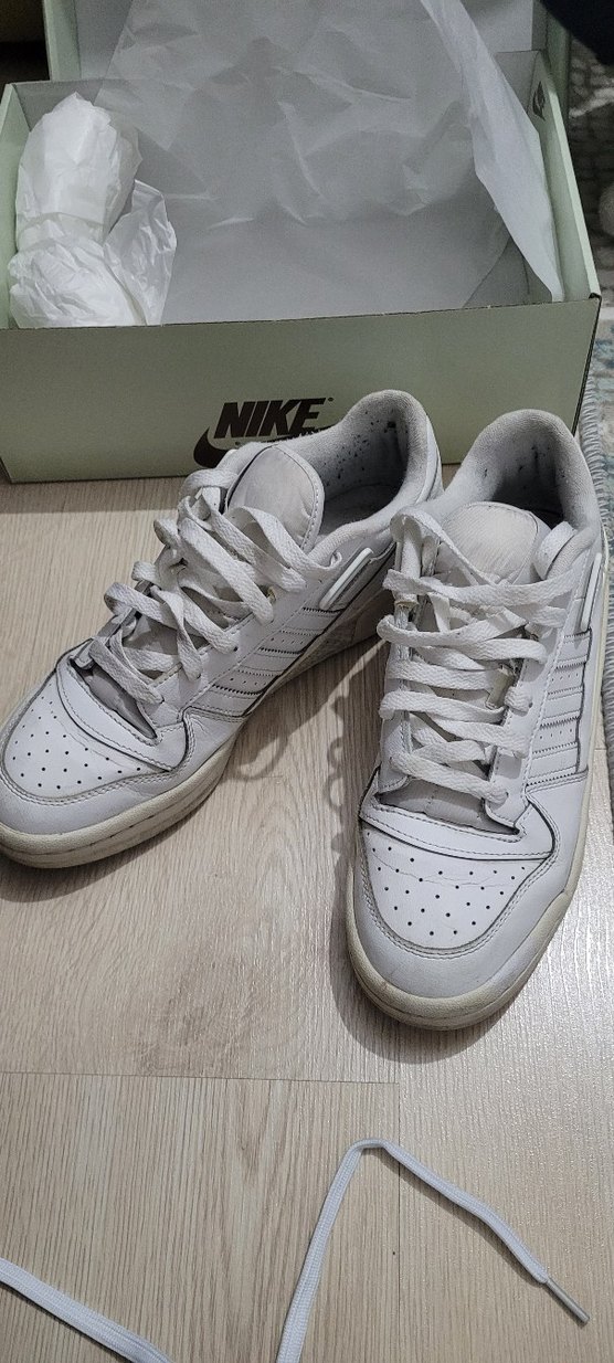 Adidas markalı, bağcıklı, düz tabanlı beyaz erkek spor ayakkabısı. Spor ve günlük kullanıma uygun sade tasarım. orjinaldir. öğrenciyim her şeyi satıp memlekete döneceğim uyguna koyuyorum.