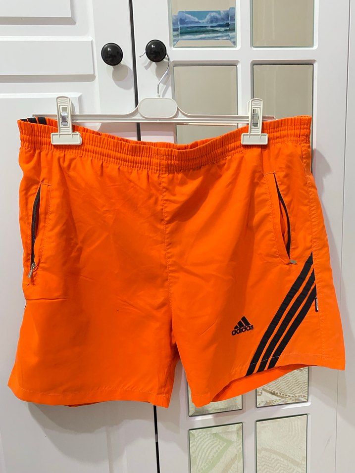 Erkek şort/ göründüğünden daha soft bir turuncu/ sol tarafında küçük bir delik var, fotoğrafını çektim/ bedeni L / adidas erkek deniz şortu/ beli lastikli 50 cm boyu 43 cm Erkekler için parlak turuncu renkte, kısa ve fit kesim spor şort. Cırt cırtlı cepler ve Adidas'ın sportif sokak tarzı detayları bulunur.