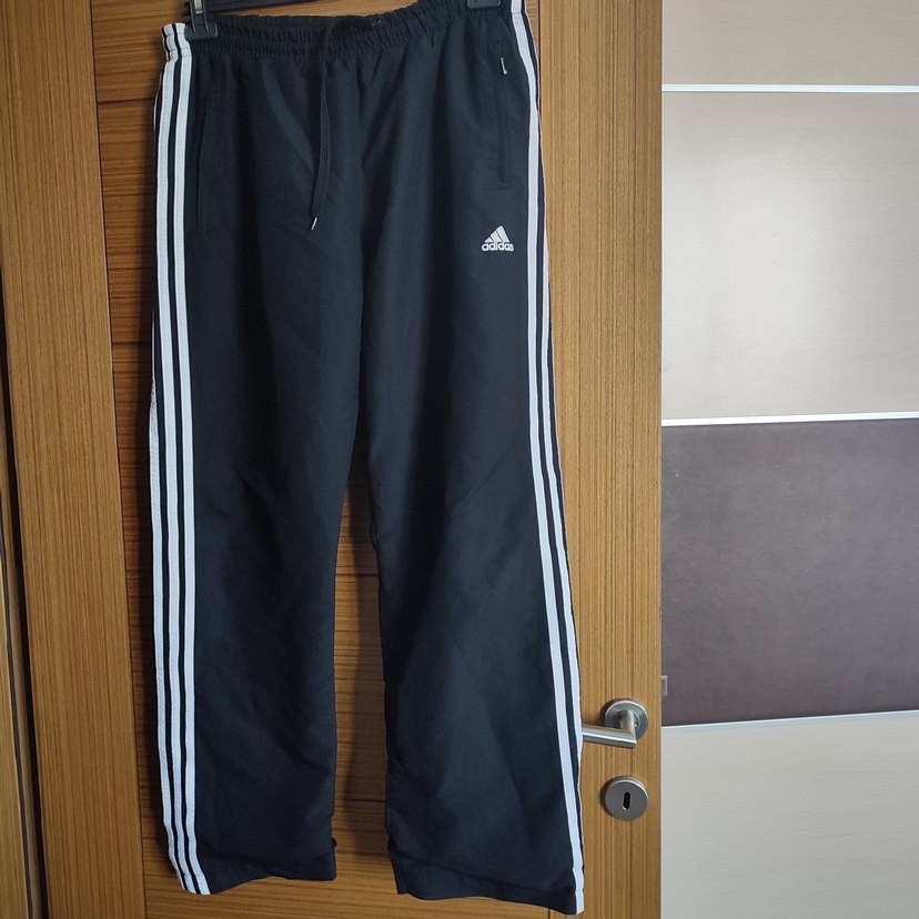 Siyah Adidas erkek eşofman altı, bol kesim ve cırt cırtlı detaylı. Sentetik kumaştan, yanlarda beyaz şeritler ile sokak stili için uygun. orjinal ürün sadece paça uçları yıpranmış bir iki cm kesilse hiçbir sorunu yoktur 102cm bel 41 cm paça 21 cm