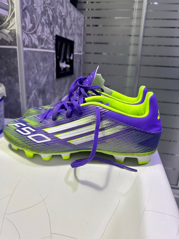 Erkek futbol ayakkabısı, renkli tie-dye desenli, bağcıklı ve kauçuk tabanlıdır. Mor ve neon yeşil tonlarında çağdaş tarzda tasarlanmıştır. ⚽