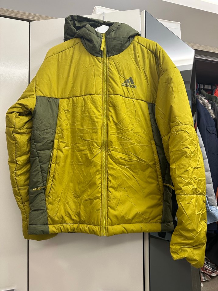 Adidas erkek mont, fermuarlı ve yüksek yakalıdır. Uzun kollu, fitted kesim ve yumuşak, sıcak kumaştan yapılmıştır. Koyu sarı ve yeşil tonlarında, günlük ve sokak stili için uygundur.