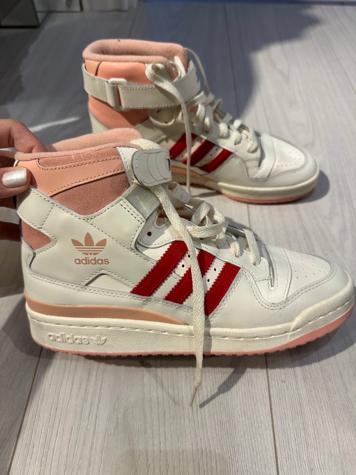 Adidas beyaz ve kırmızı platform topuklu spor ayakkabı, bağcıklı ve baskılı detaylara sahip, dayanıklı kauçuk malzemeden üretilmiştir. Spor sokak giyimine uygundur. Pudra pembe detayları aşırı tatlı ayağıma küçük geliyor yoksa satmamm