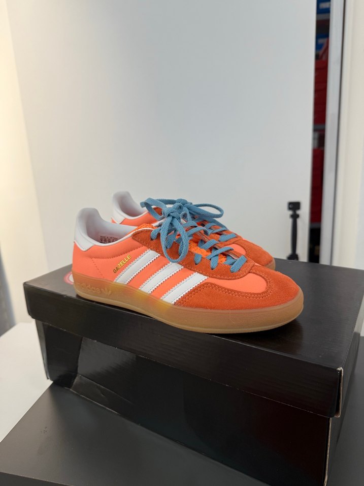Turuncu tonlarda renkli tie-dye desenli, kauçuk tabanlı Adidas kadın spor ayakkabısı. Mavi bağcıklar, cırt cırtlı kapama ve yüksek topuklu tasarım içerir. Ürün sıfırdır, orijinaldir. Numarası küçük geldiği için satıştadır. #adidas #adidasgazelle #gazelle