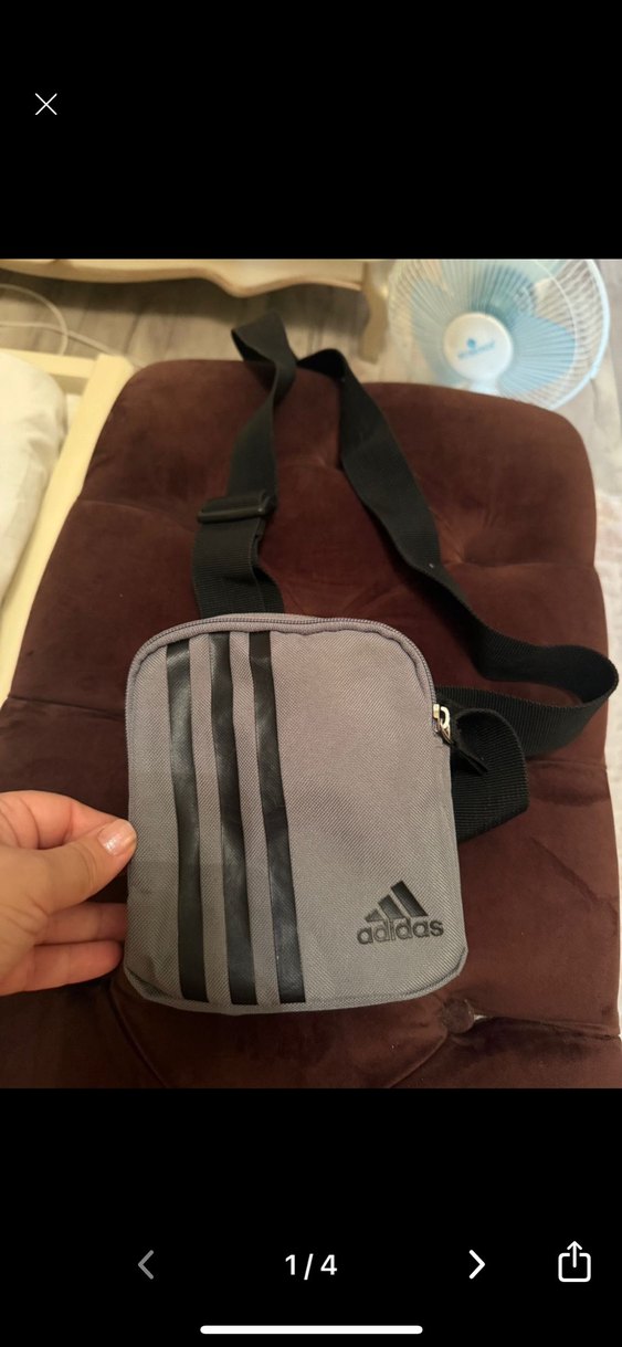 Ayarlanabilir tokalı kayışı ve baskılı çizgileri olan gri Adidas erkek omuz çantası, trend sokak giyimi ve athleisure tarzları için uygun.