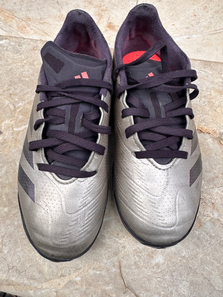 Gri renkli, velcro ve bağcıklı detaylara sahip modern tasarım futbol ayakkabısı. Dayanıklı kauçuk tabanlı. ⚽ Hiçbir deformesi yoktur. 33,5 numara