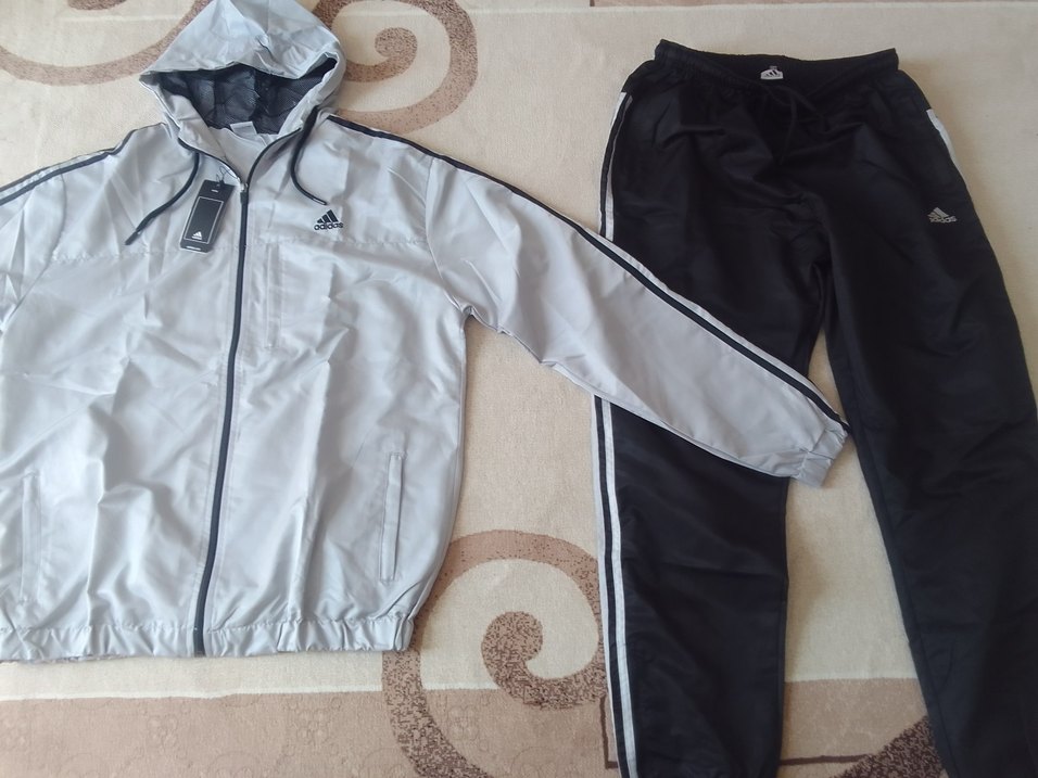 Adidas gri erkek spor yağmurluğu, uzun kollu, bisiklet yaka, fermuarlı ve bol kesimdir. Siyah yan çizgili eşofmanla tamamlanmıştır. Spor ve rahat stil için uygundur. ♂️