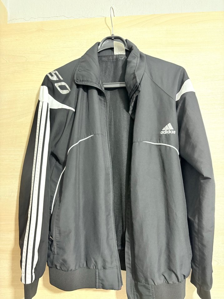 Adidas marka, bol kesim, yüksek yakalı, uzun kollu erkek spor ceketi. Sentetik kumaştan, fermuarlı ve gri renkte, beyaz şerit detaylıdır. ♂️