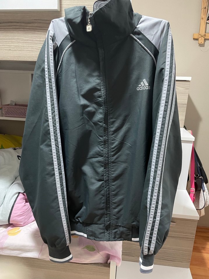 Adidas gri fermuarlı spor mont, yüksek yakalı ve uzun kollu, sentetik kumaştan, sportif ve şık bir görünüm sunar.