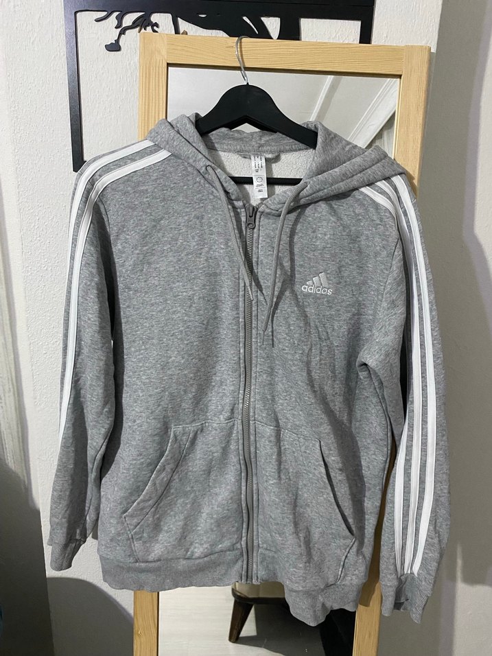 Adidas marka, fermuarlı, yüksek yakalı ve uzun kollu gri ceket. Yumuşak, sıcak kumaştan, dar kesim ve kollarda sportif çizgilerle günlük kullanıma uygun.