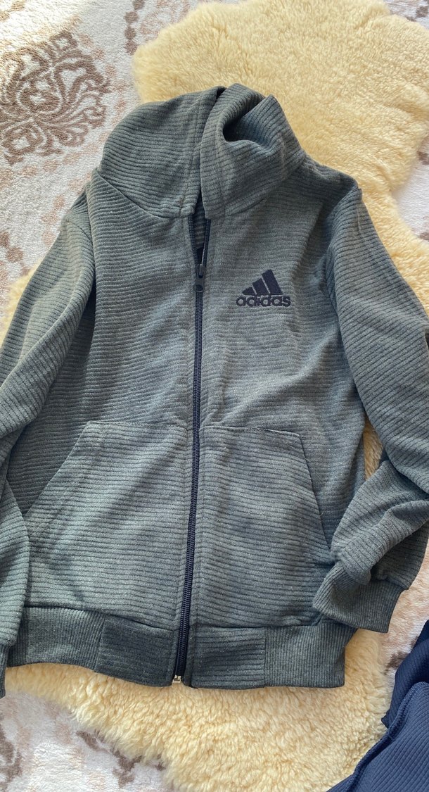 Adidas markalı, gri renkte, kapüşonlu ve fermuarlı erkek sweatshirt. Yumuşak, fit kesim ve çizgili dokusu ile spor ve sokak tarzına uygun.
