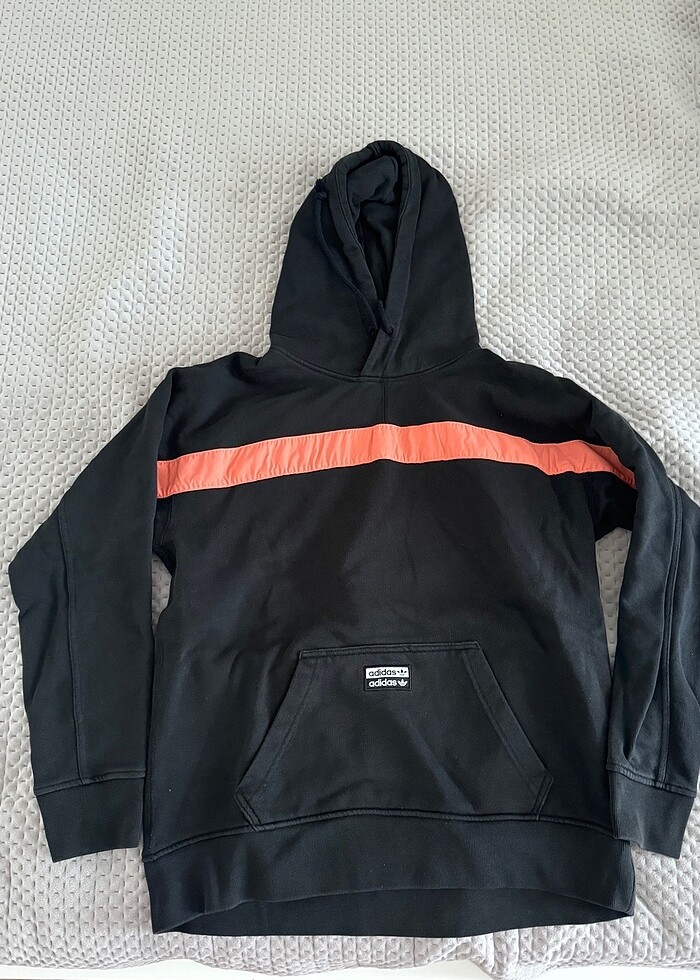Siyah adidas hoodie arkası yazılı önü çizgili. Beymenden alındı. Unisex.