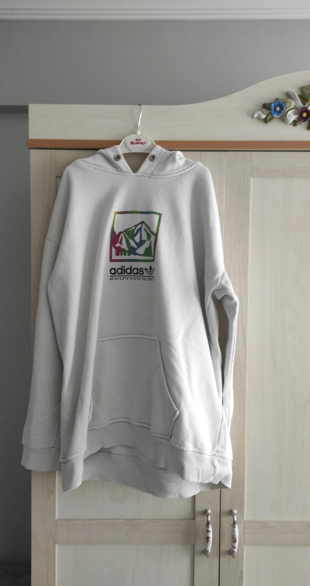 adidas marka, uzun kollu, kapüşonlu, bol kesim beyaz sweatshirt. Önünde renkli baskı ve yumuşak, sıcak kumaş bulunur. Günlük kullanıma uygun.