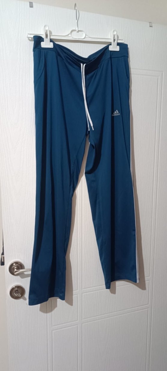 Adidas marka, sentetik kumaştan üretilmiş, fermuarlı cepleri olan, koyu mavi renkli ve rahat kesim eşofman altı.