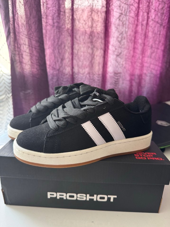 Adidas siyah kadın spor ayakkabısı, beyaz baskılı çizgiler ve velcro detaylı, kauçuk tabanlı. Spor ve günlük sokak stili için uygun. PROSHOT yazılı.