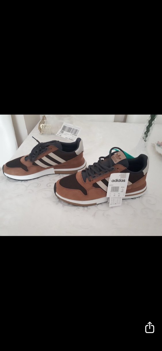 Adidas marka, kahverengi baskılı desenli, bağcıklı ve kauçuk tabanlı erkek spor ayakkabısı.