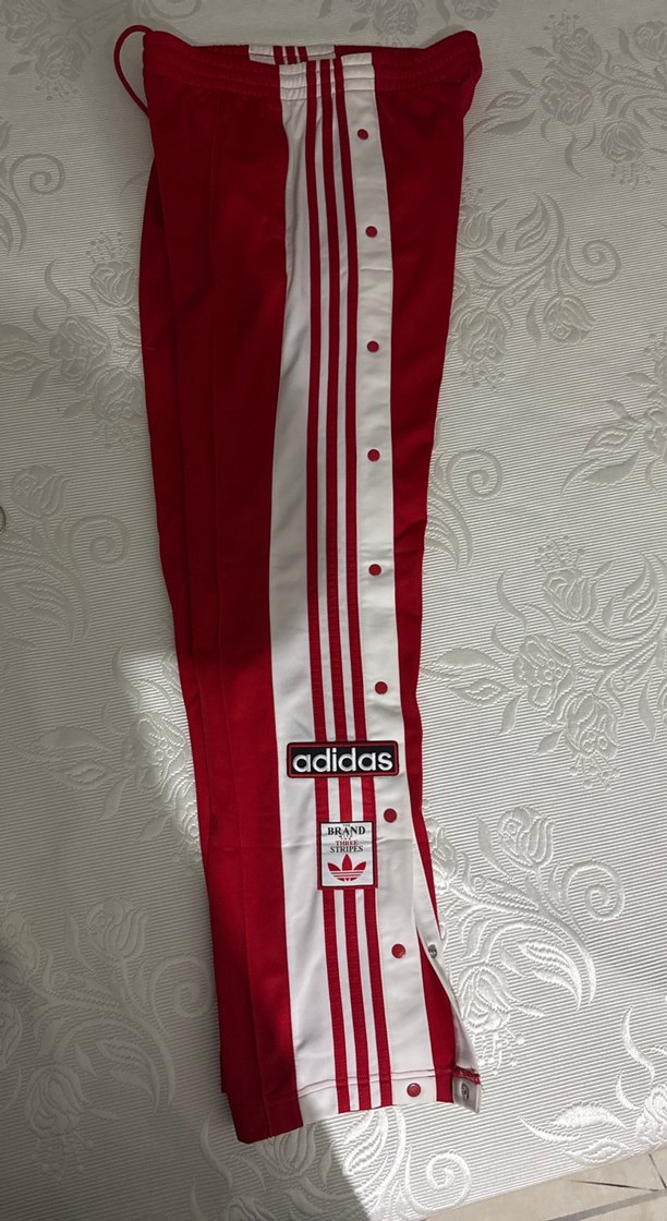Düğmeli yan detaylı, beyaz çizgili kırmızı Adidas kadın eşofman. Sentetik kumaştan, spor ve gündelik kullanıma uygun. ♀️
