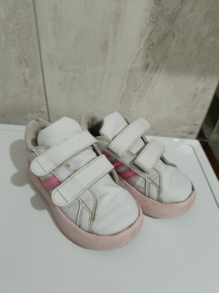 Beyaz, pastel pembe detaylı kız çocuk adidas, cırt cırtlı ve kauçuk tabanlı. Trendy ve rahat sokak stili için uygun.