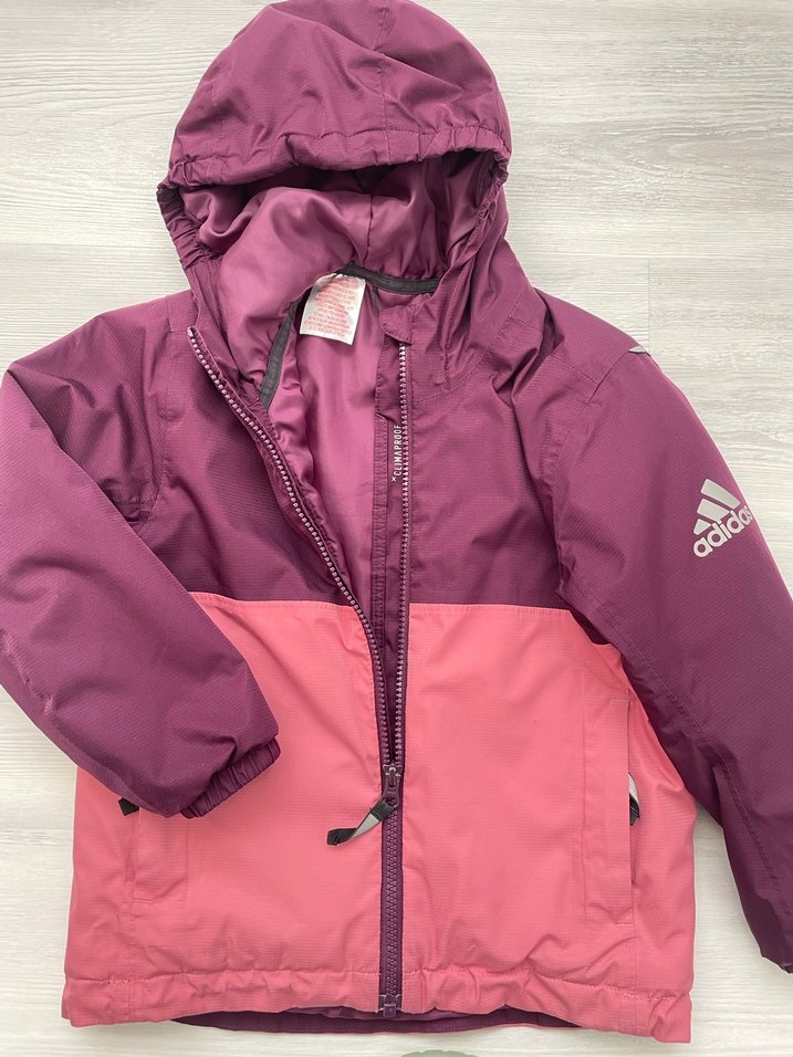 Adidas Kız Çocuk Mont, Orjinaldir, Az kullanılmıştır, Herhangi bir deformasyon yoktur, Ceplidir, Detaylı iç etiket fotoğraflarda mevcuttur, En:39 cm, Boy:46 cm, 5 yaş, Pembe mor renkli