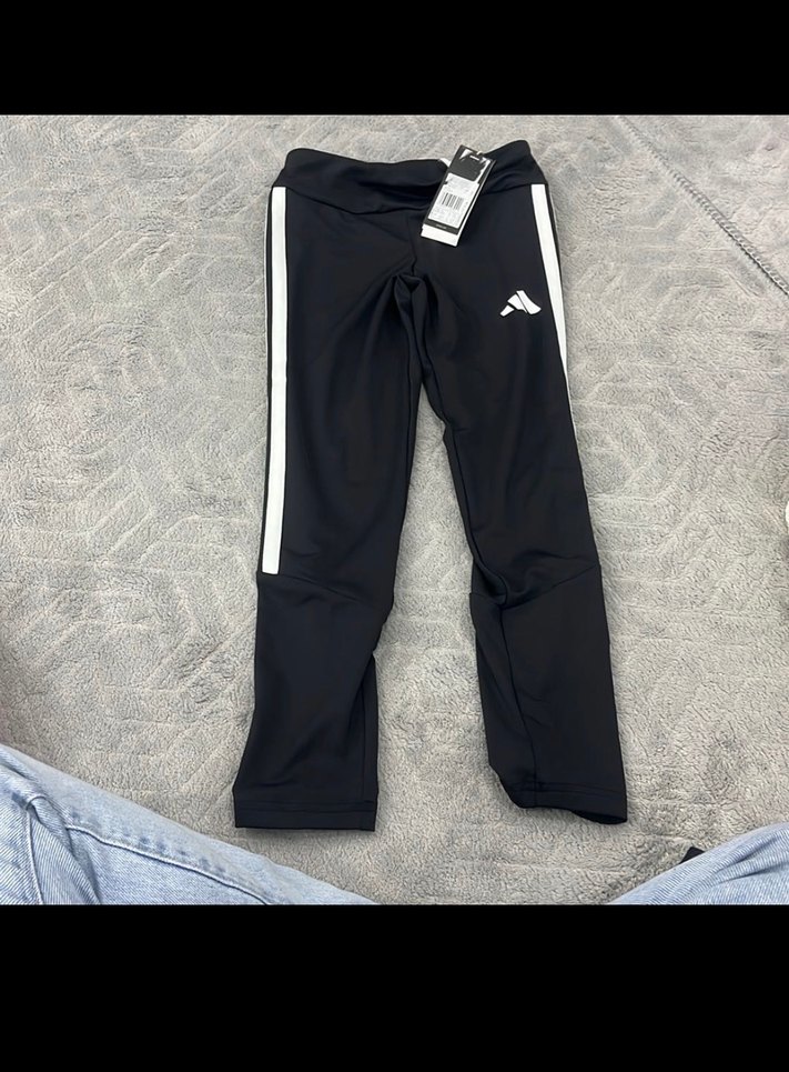 Kızlar için siyah dar kesim elastik bel ve beyaz yan şeritlere sahip, sentetik kumaştan üretilmiştir.