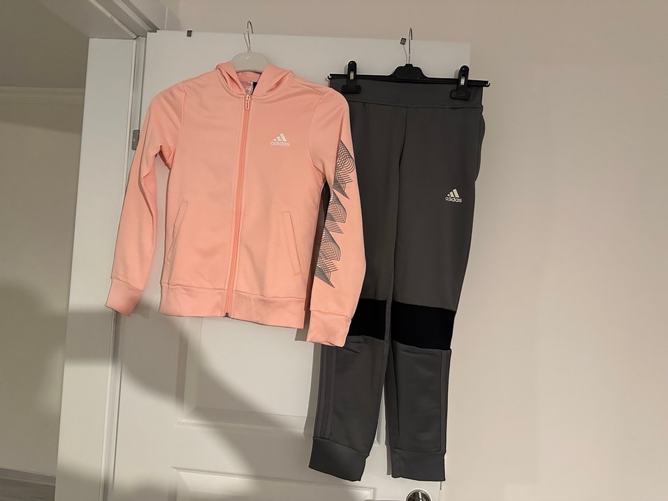 Adidas kızlar için pembe fermuarlı kapüşonlu sweatshirt ve gri fermuarlı cepli, baskılı kollu, fitted eşofman altı. Sokak stili için uygun. ♀️