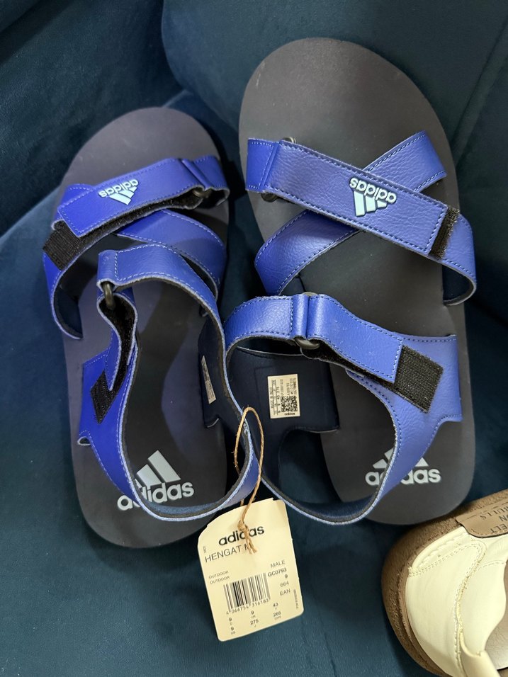 Adidas erkek sandaletleri, koyu mavi ve baskılı detaylarla, ayarlanabilir cırt cırtlı bantlara sahiptir. Kauçuk tabanlı, rahat ve sokak stili için uygundur.