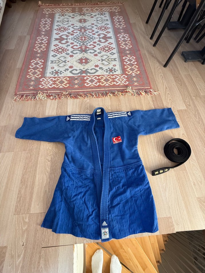1.60 Adidas lacivert judo kıyafeti, Türk bayrağı rozeti ve siyah kuşak ile. Dayanıklı kumaştan üretilmiştir. Judogi altının ağı yırtık olduğı için koymadım yama yapıldığında kullanabilirsiniz alan kişiye altınıda göndereceğim judogi altı için ücret almayacağım