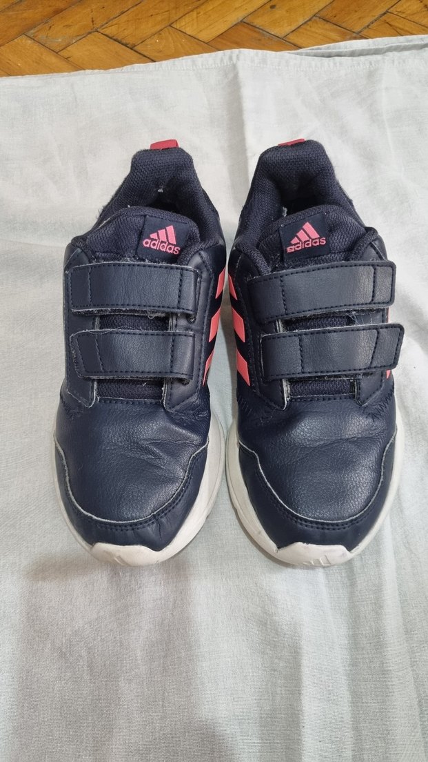 Adidas markalı, koyu lacivert renkli, kayışlı ve kauçuk tabanlı spor ayakkabısı. Trendy casual stil için uygundur.