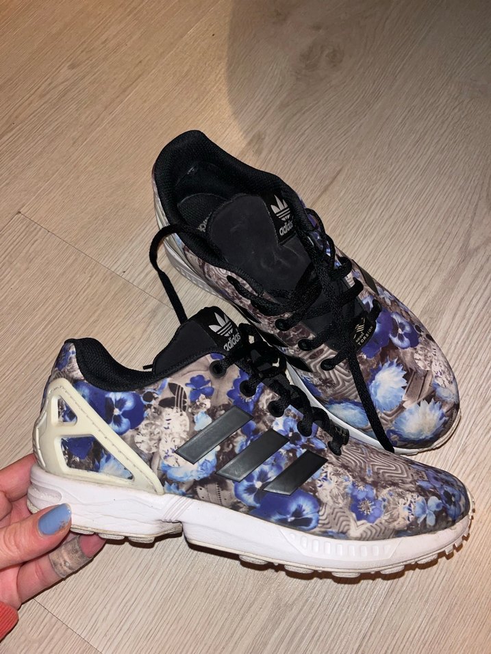 Adidas kadın spor ayakkabısı, koyu mavi baskılı desen, düz kauçuk taban ve bağcıklı tasarıma sahiptir, sokak modası ve athleisure konforunu birleştirir.