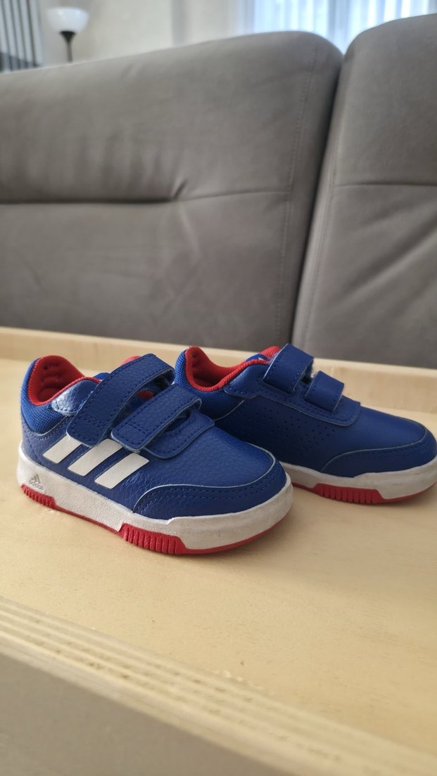 Mavi renkli, cırt cırtlı ve renkli baskılı detaylara sahip erkek çocuk spor ayakkabısı. Kauçuk tabanlıdır, günlük sokak stili için uygundur. Adidas 22 numara