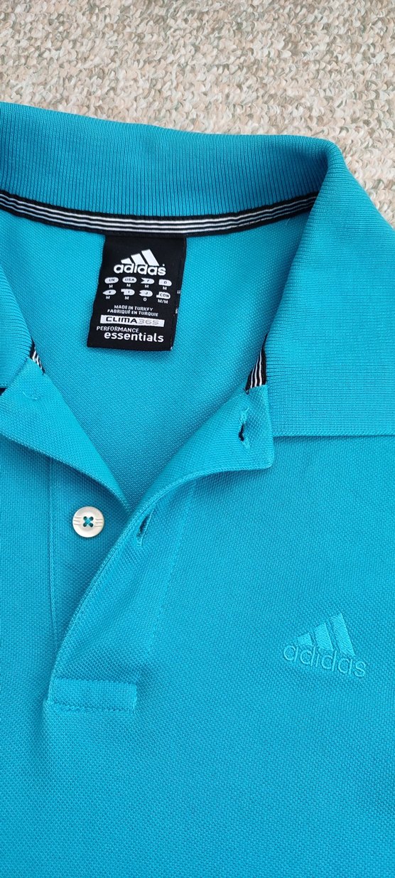 Mavi renkli, düğmeli yakaya sahip Adidas polo tişört. Sentetik kumaştan üretilmiş, sportif ve sokak stili için uygun, ince kesim.