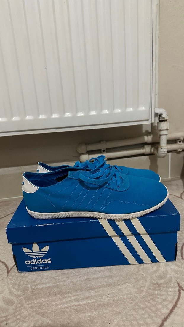 adidas marka, düz tabanlı, açık mavi renkli kadın spor ayakkabısı, rahat ve şık sokak stili için idealdir.