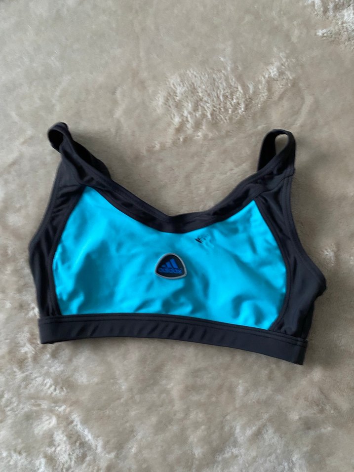 Adidas markalı, koyu ve parlak mavi renklerde, desen içermeyen sporcu sütyeni, athleisure ve streetwear tarzına uygun. Lekesi var bikini üst.