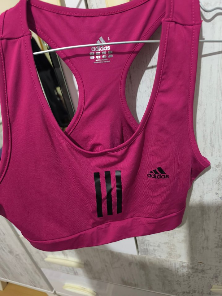 Koyu pembe renkli Adidas spor sütyeni, baskılı desen ve mini kısa kesime sahiptir. Streetwear ve athleisure tarzına uygundur. ♀️hamile kalınca yeni kullanılmadan