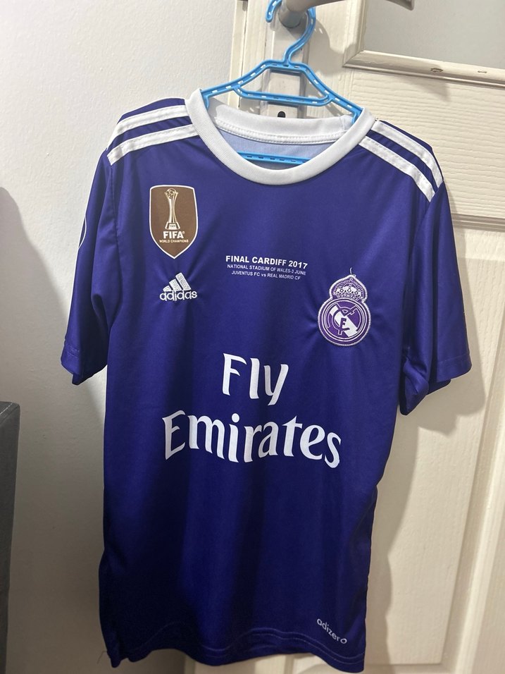 Adidas Real Madrid 2016-17 sezonu mor (3. forma). Final Cardiff 2017 baskılı, Juventus-Real Madrid finaline özel detayları bulunuyor. Hafif kullanım izleri olabilir, genel durumu iyi. Günlük kullanım veya koleksiyon için ideal. Ölçü isteyen yazabilir. 10-11 yaşa uygundur. Makul tekliflere açıktır.