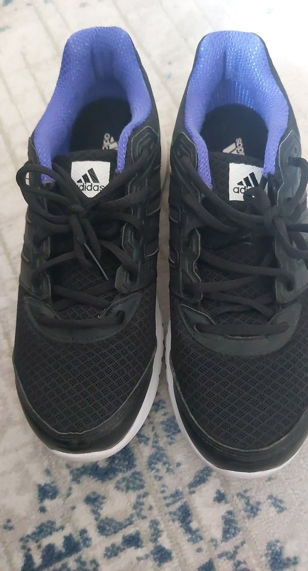 Adidas marka, mor detaylı siyah spor ayakkabı. Düz tabanlı, kauçuk taban özellikli, günlük spor ve sokak stili için uygun.Kücük geldigi icin çok kullanılmadı